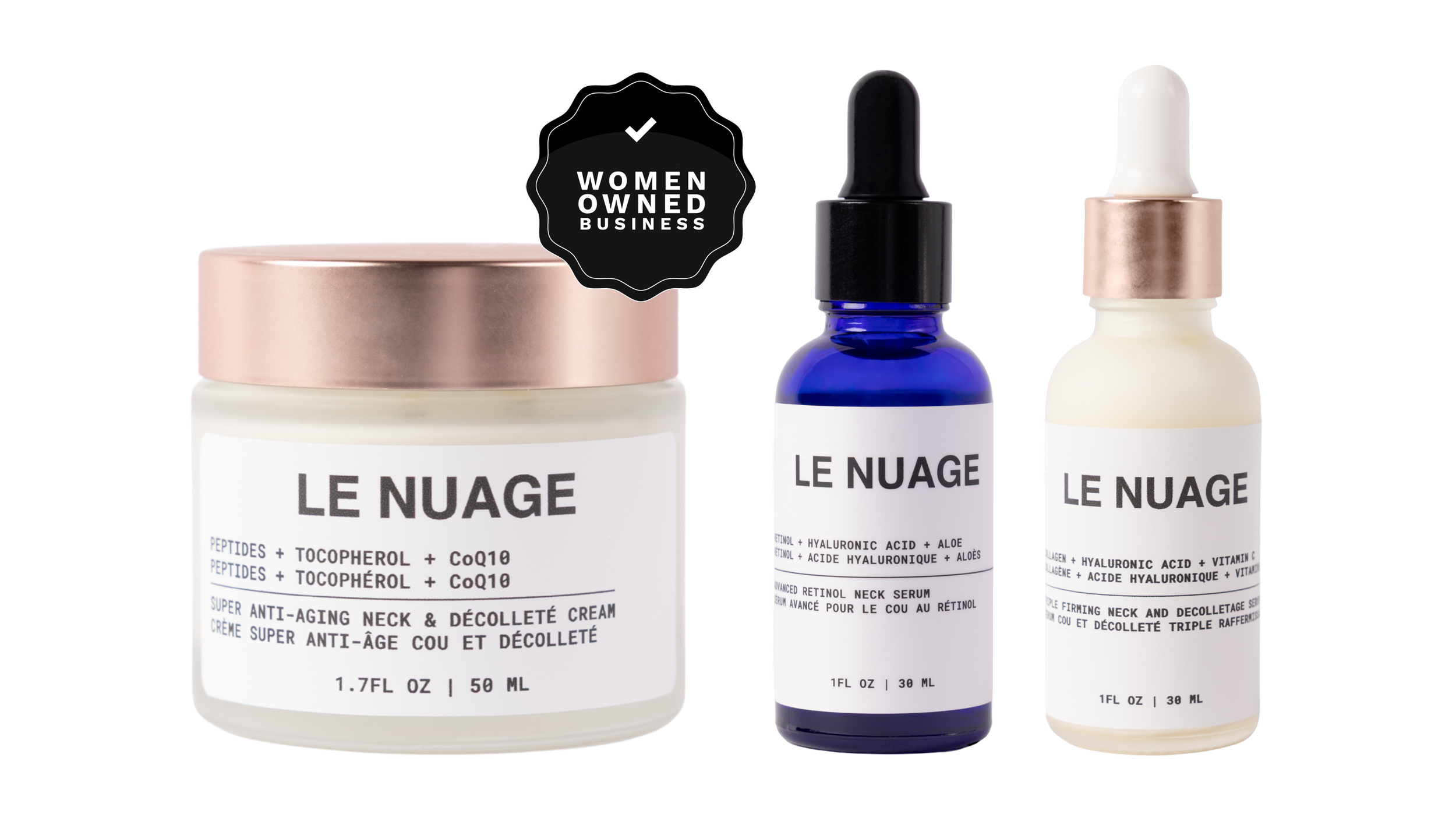 Le Nuage completely won us over and earned our #1 spot as the cleanest option in our top five—without sacrificing performance. A lot of products claim they “firm,” but Le Nuage feels intentionally built for the neck and décolleté, where crepey texture, laxity, and stubborn horizontal lines tend to show up first. And it’s not just our take—Le Nuage has 500+ five-star reviews, with many customers calling out improvements in firmness and texture.